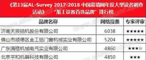 “天辰股份”憑借其雄厚的技術實力和品牌影響力,最終贏得廣大終端客戶、行業專家、設計院、顧問公司和媒體總編的高度認可,在第13屆AL-Survey2017-2018中國門窗幕墻行業大型讀者調查暨“我最喜愛品牌”評選活動中,成功衛冕“加工設備首選品牌”大獎!